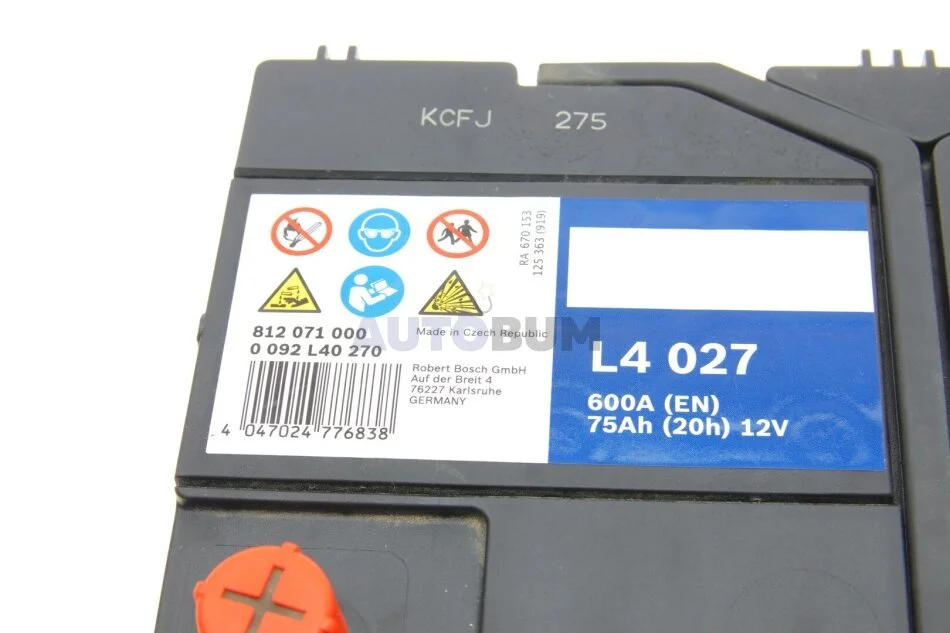 Акумулятор 12В/75Аг/600А/18,1кг BOSCH 0 092 L40 270