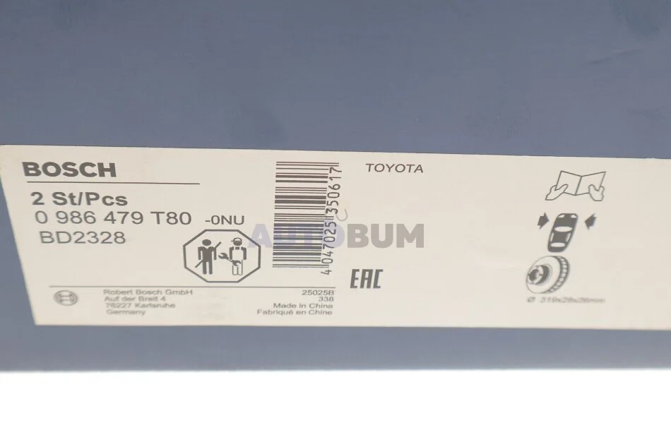 Диск гальмівний TOYOTA Fortuner/Hilux 319 mm \'\'F \'\'2,5-3,0 \'\'04>> BOSCH 0 986 479 T80