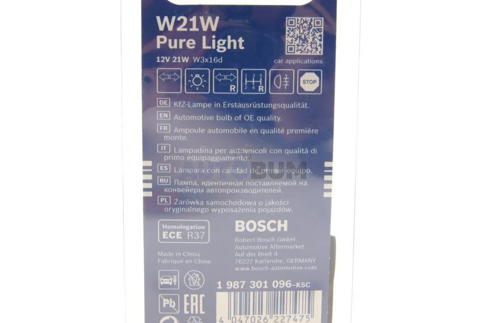 Лампочка Pure Light допоміжна W21W (2 шт, 12 В, 21 Вт, тип гнізда: W3X16D) BOSCH 1 987 301 096