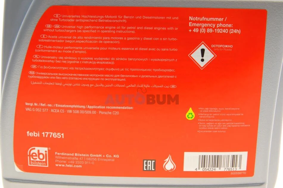 Олива моторна 0W-20 5L VW 508.00, VW 509.00, PORSCHE C20, ACEA C5 FEBI BILSTEIN 177651