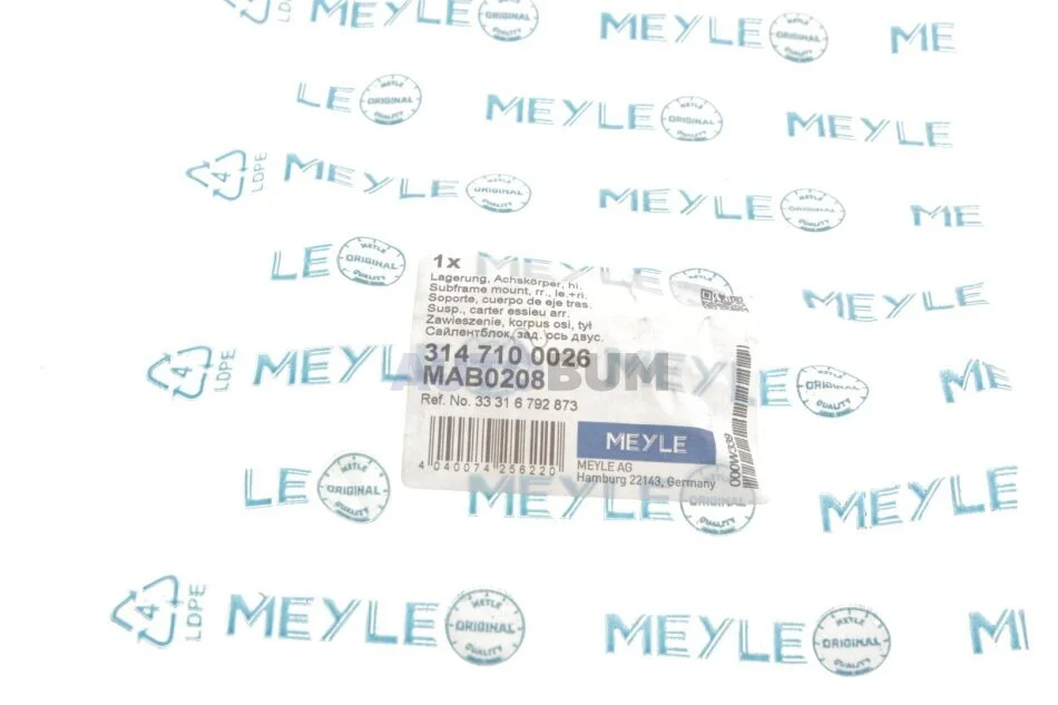 Сайлентблок балки підвіски (з передньої сторони) Лів/Прав BMW 5 (F10), 5 (F11), 5 GRAN TURISMO (F07), 6 (F12), 6 (F13), 6 GRAN COUPE (F06), 7 (F01, F02, F03, F04) 2.0-6.0 02.08-10.18 MEYLE 314 710 0026
