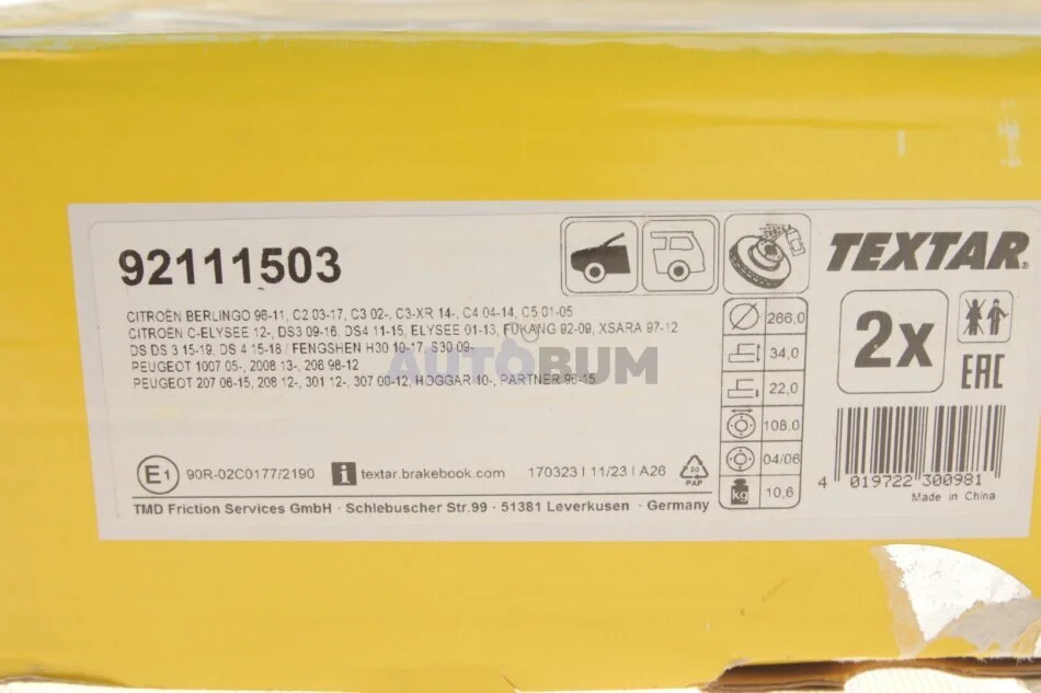 - TEXTAR 92111503 підходить до марок/моделей авто: