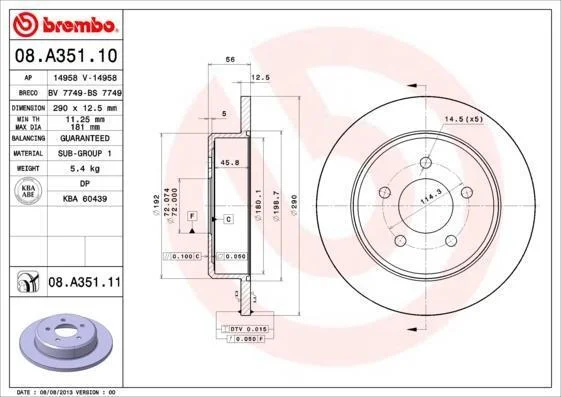 - BREMBO 08.A351.11 подходит к маркам/моделям авто: