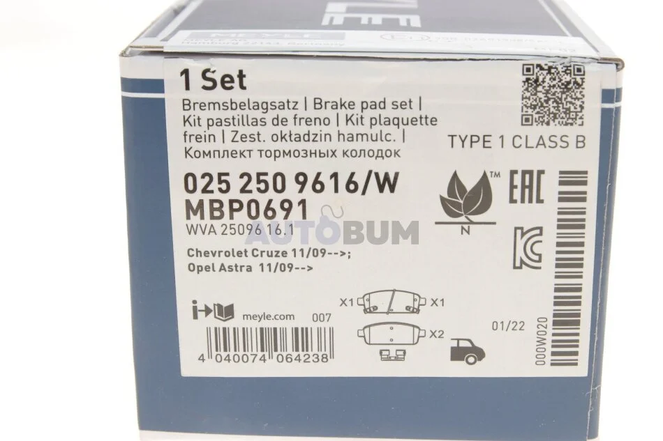 Тормозные колодки дисковые GM AVEO/CRUZE/ASTRA J 09- задн. компл. MEYLE 025 250 9616/W