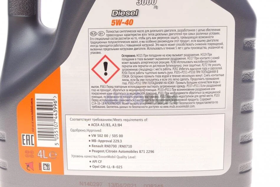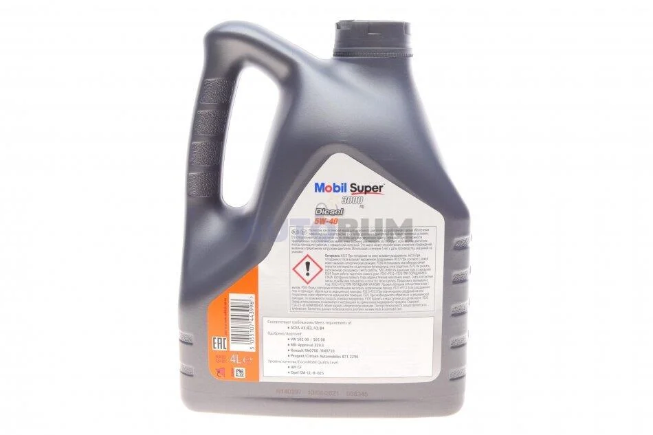Олива двигуна 4L Super 3000 X1 Diesel 5W40 (ACEA A3/B3 A3/B4 MB 229.3 RN 0710/0700 GM-LL- B-025 VW 502.00/505.00 Peugeot/Citroën B71 2296 BMW LL 01) MOBIL 152572